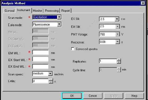 Click on the 'OK' button on the set-up screen to start the wavelength scan for excitation spectrum.