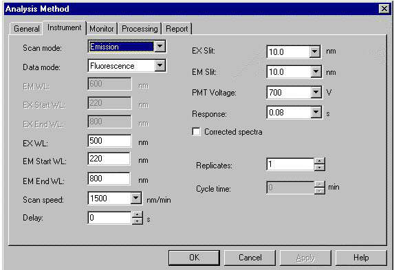 Click on the 'OK' button on the set-up screen to run the wavelength scan for emission spectrum. One has to be sure that the solvent blank does not fluoresce in the wavelength range of interest.